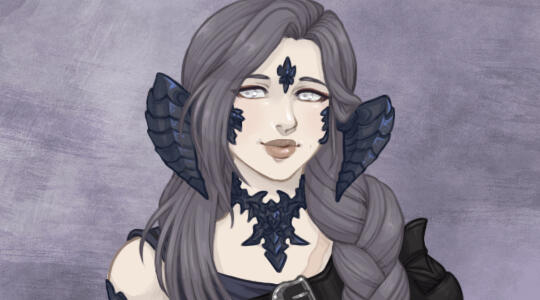 Arshtat is extremely small, even by female Au Ra comparisons and it is one of the first things people meeting her tend to focus on. She is built small and petite but with well-defined curves. Despite life living near water and in the sun of Othard, Arshtat's skin has a creamy and pale complexion. Her face is delicately heart-shaped with oval eyes, usually framed with a rust-colored powder used for decoration. She often wears a serene expression. Arshtat's hair is long, nearly to the bottom of her hips. It is usually tied back in a long braid, and is naturally a deep lavender color. Her eyes are a shimmering silver with no limbal rings.